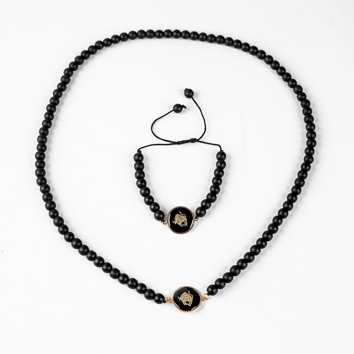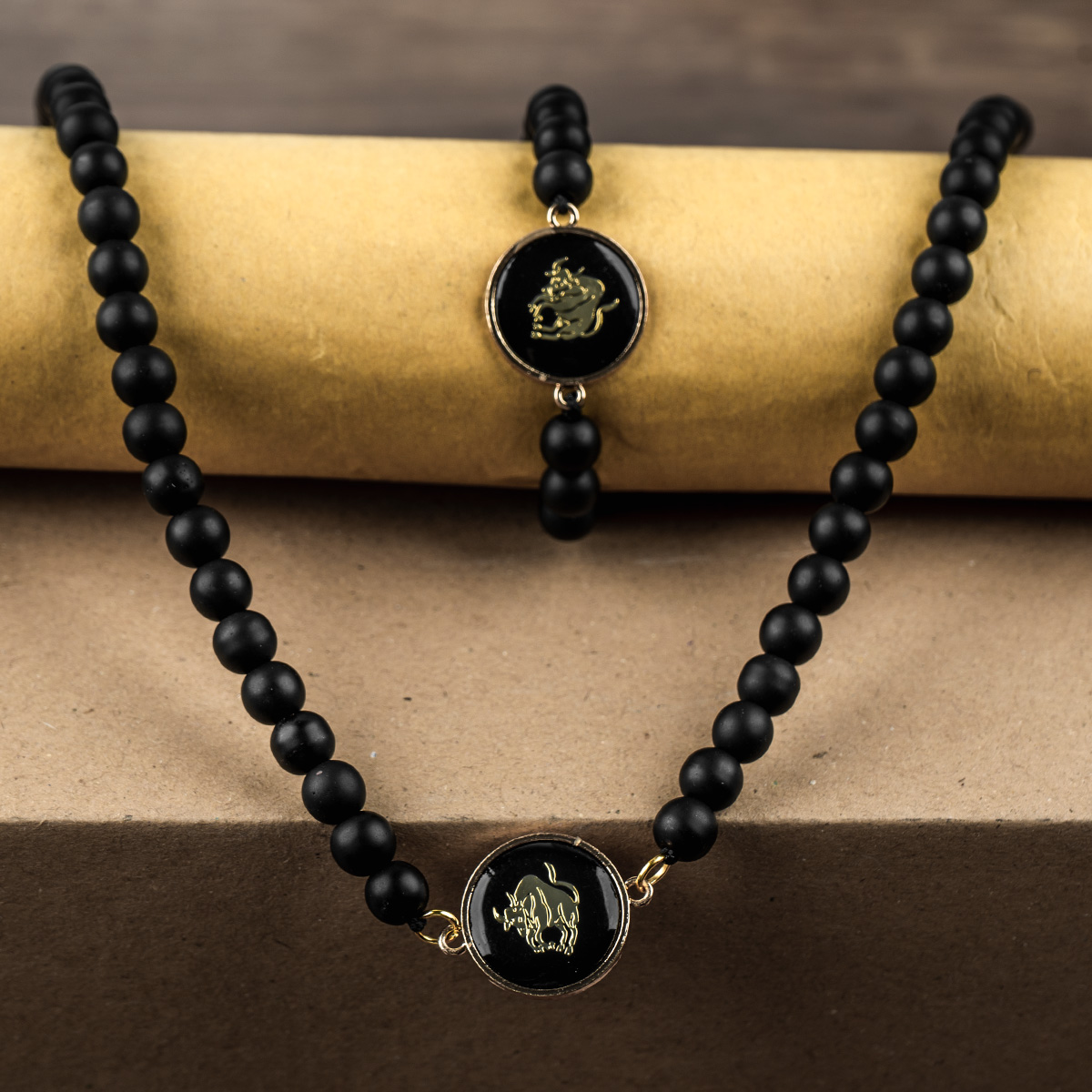 نیم ست های مهره ای مشکی از انواع گردنبندهای رو لباسی است که محبوبیت خاصی بین جوانان پیدا کرده است و جذابیت زیادی به استایل شما میدهد.طرح روی پلاک این گردنبندها نماد ماه های سال بوده و میتوانید ماه مورد نظرتان را انتخاب نمایید. قطر سنگ ها 2 میلی متر و به رنگ مشکی مات بوده و به دلیل طراحی خاص، برای استفاده روزانه و قابل ست شدن با انواع پوشش ها و مناسب برای آقایان و خانم هاست.