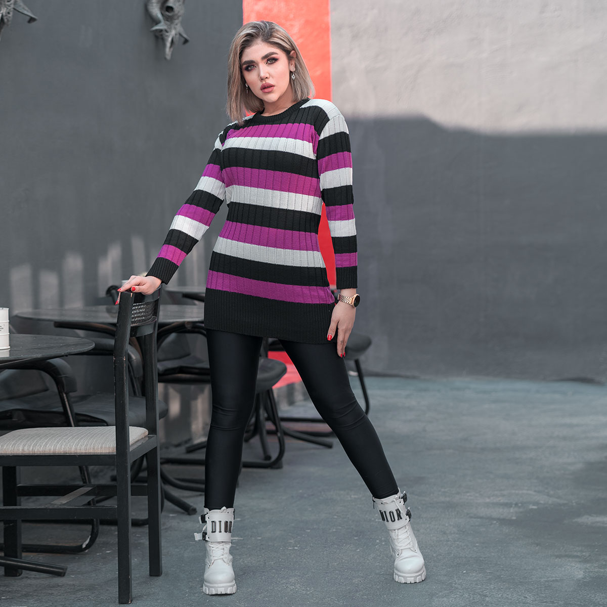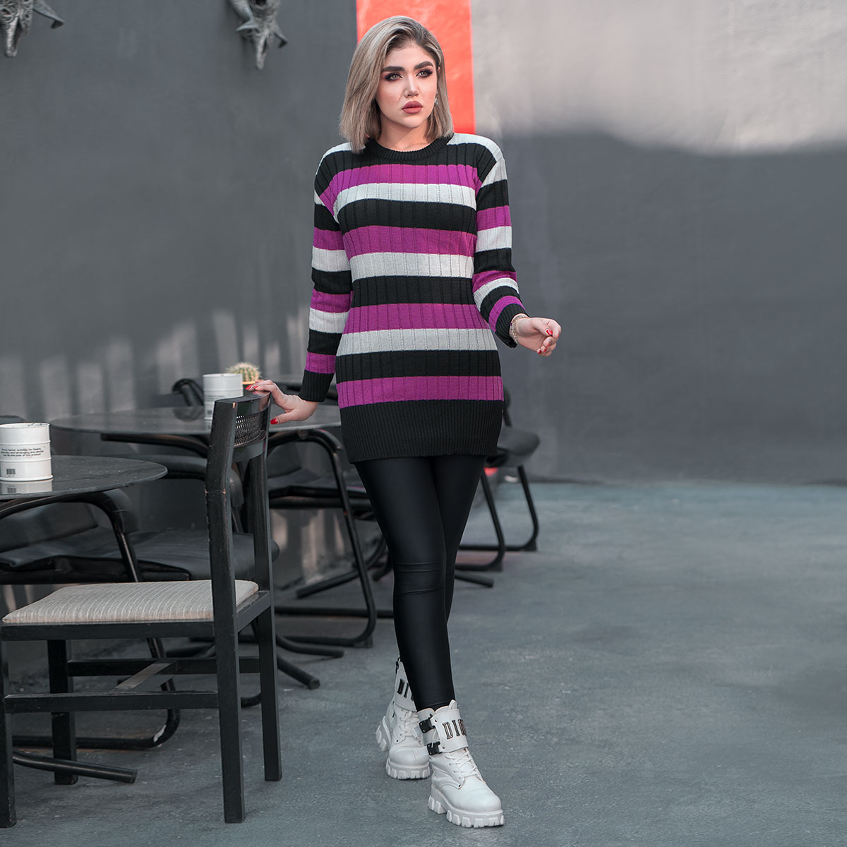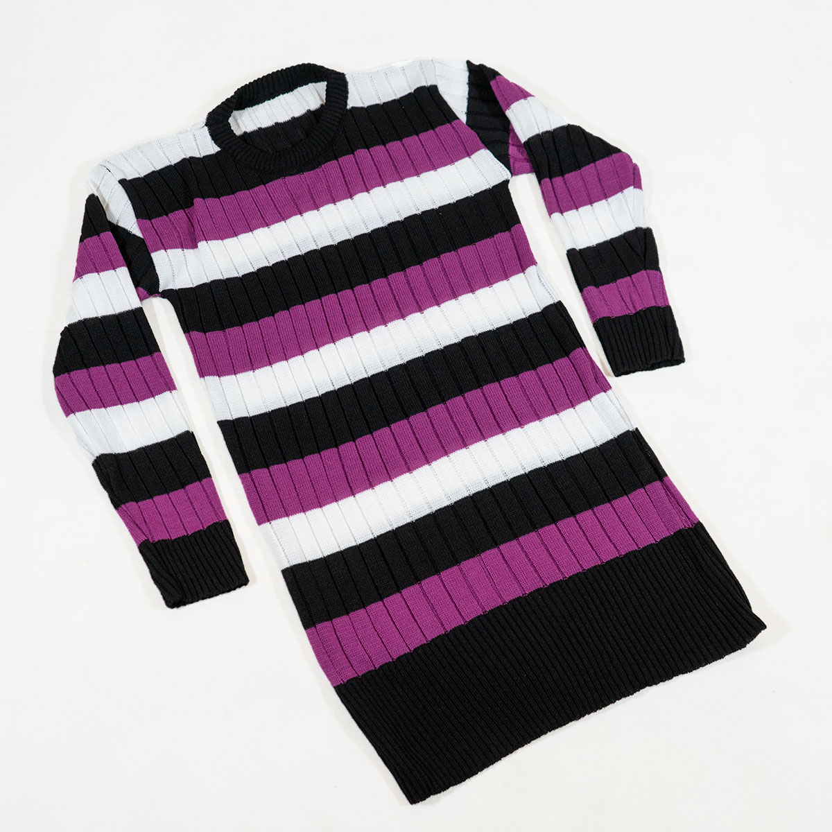 تونیک بافت زنانه راه راه بنفش مشکی مدل kareno