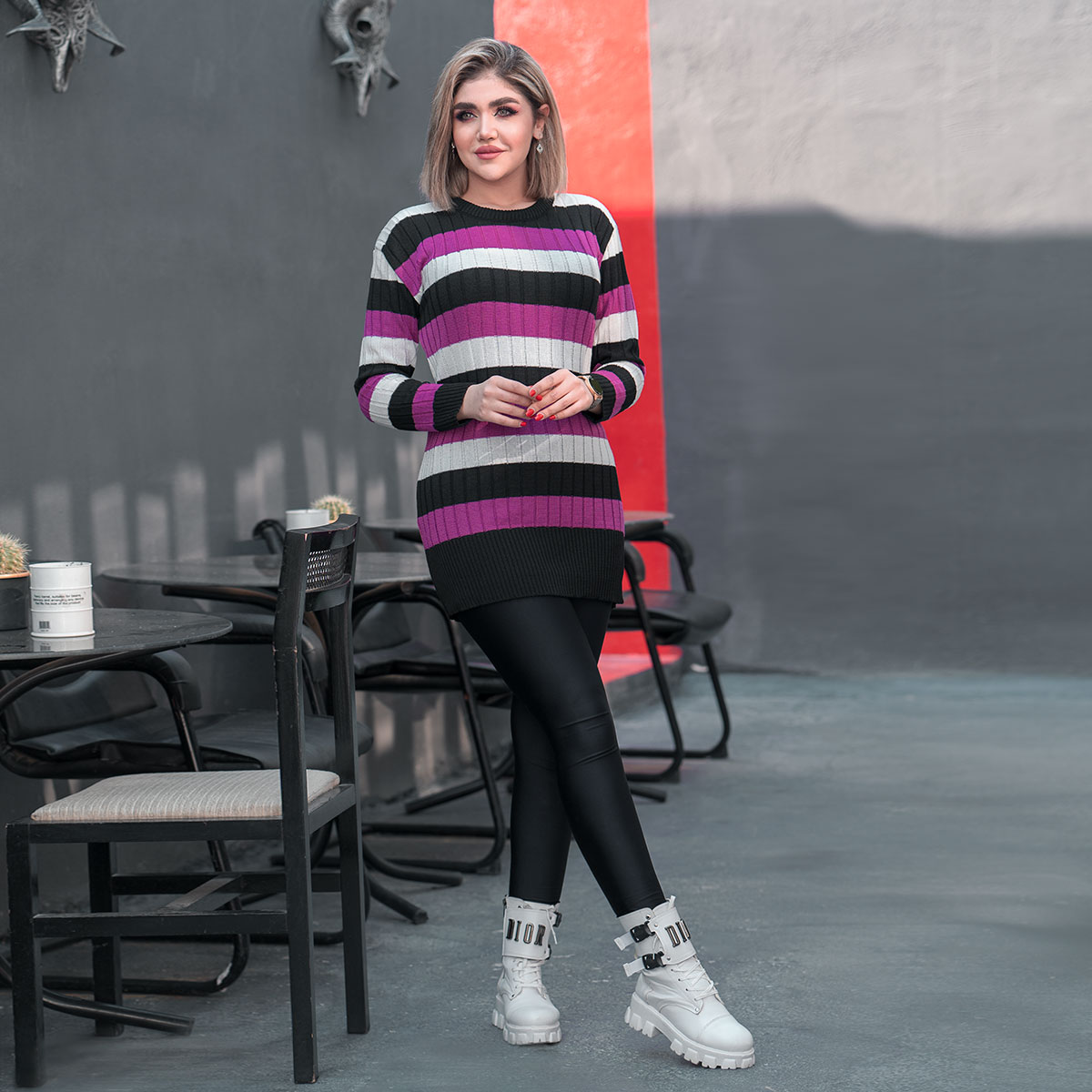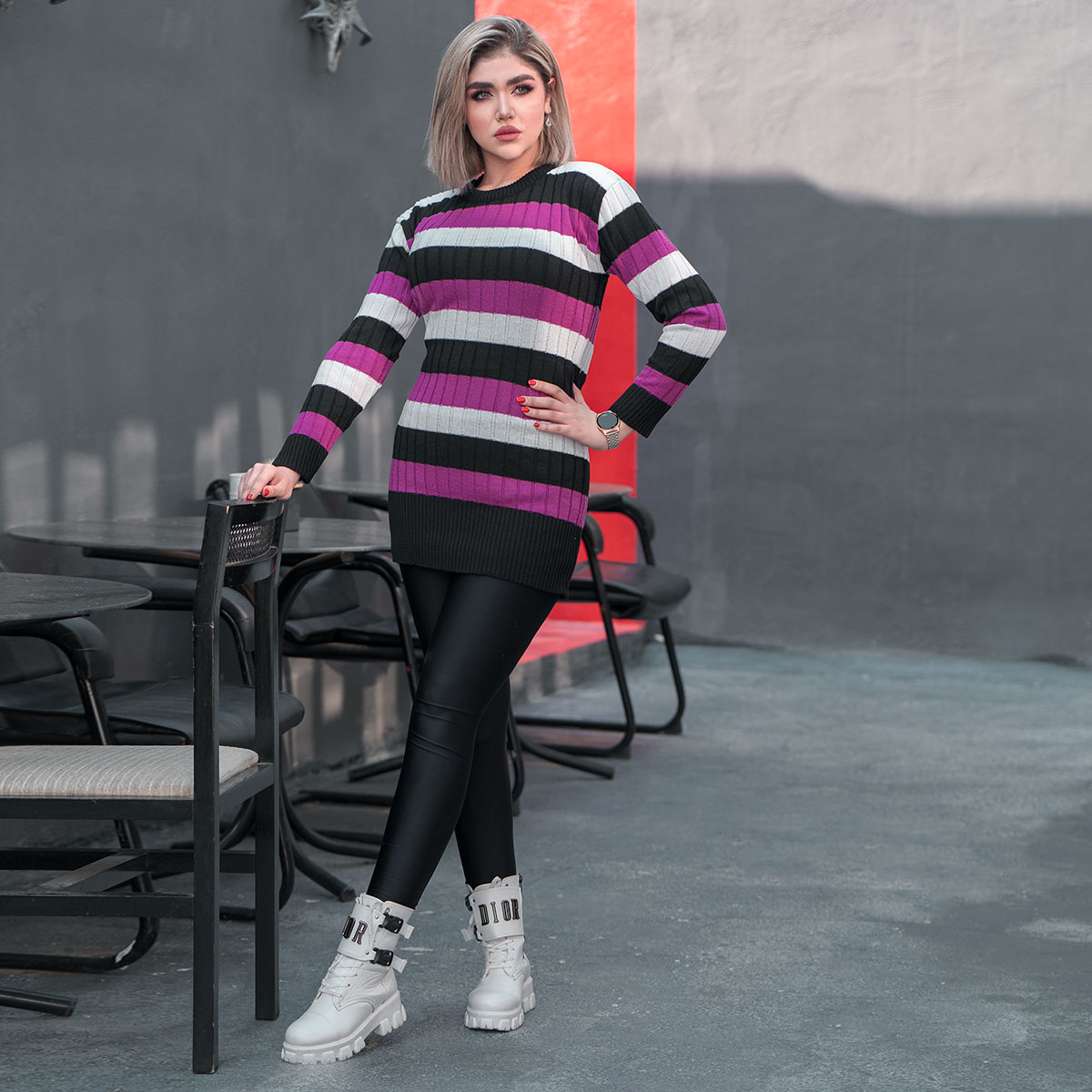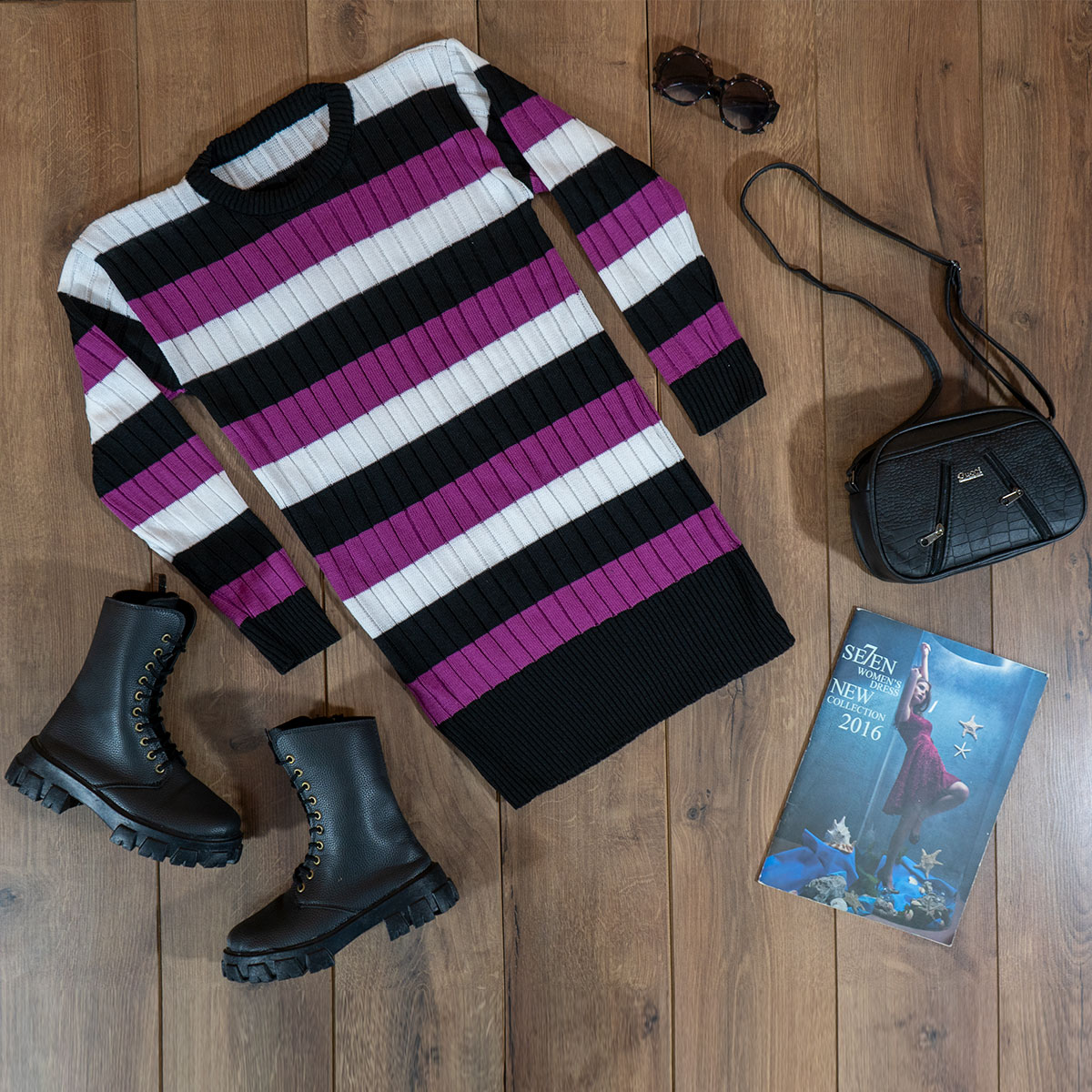 تونیک بافت زنانه راه راه بنفش مشکی مدل kareno