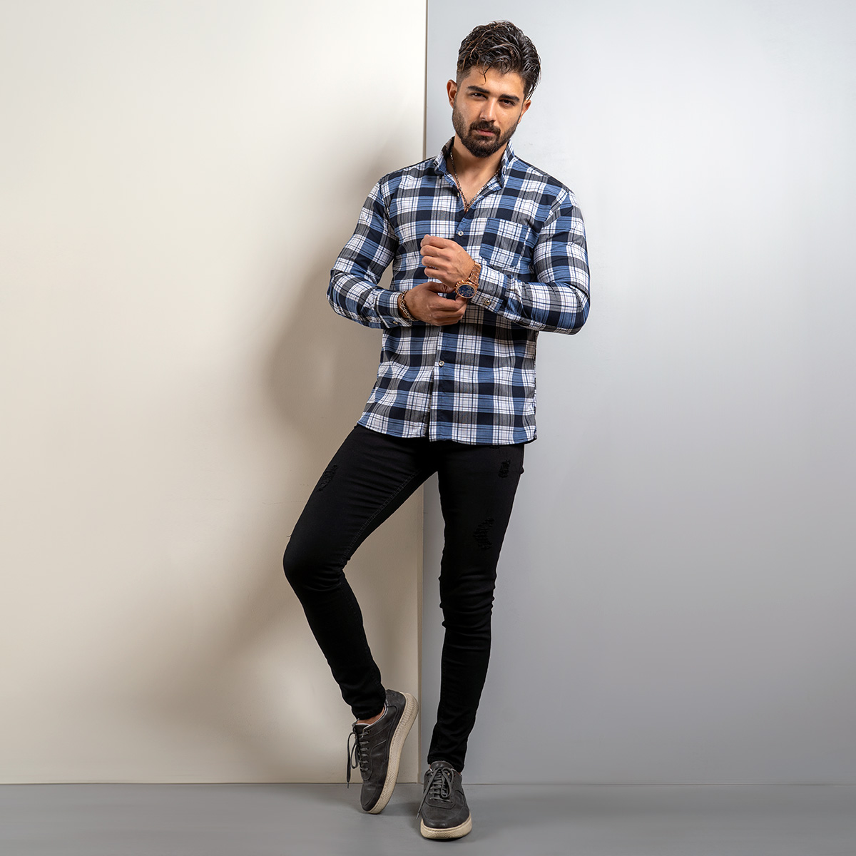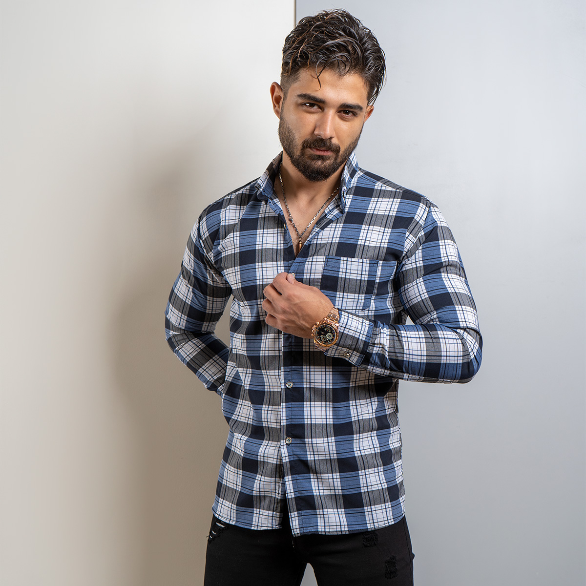 پیراهن چهارخونه مردانه سفید آبی مدل Amir