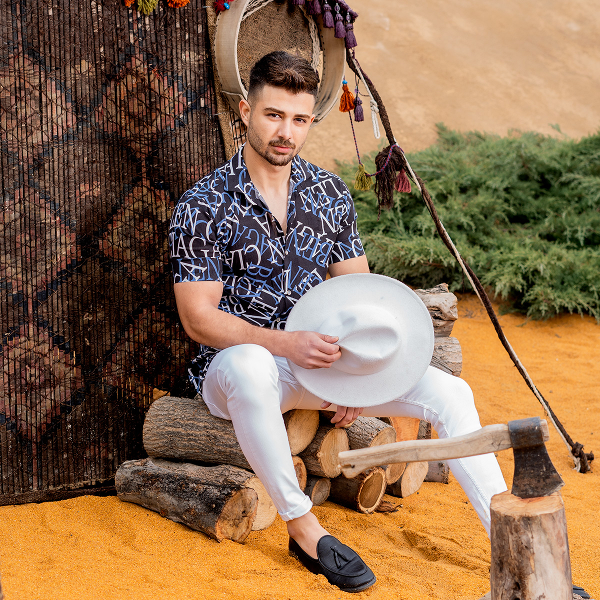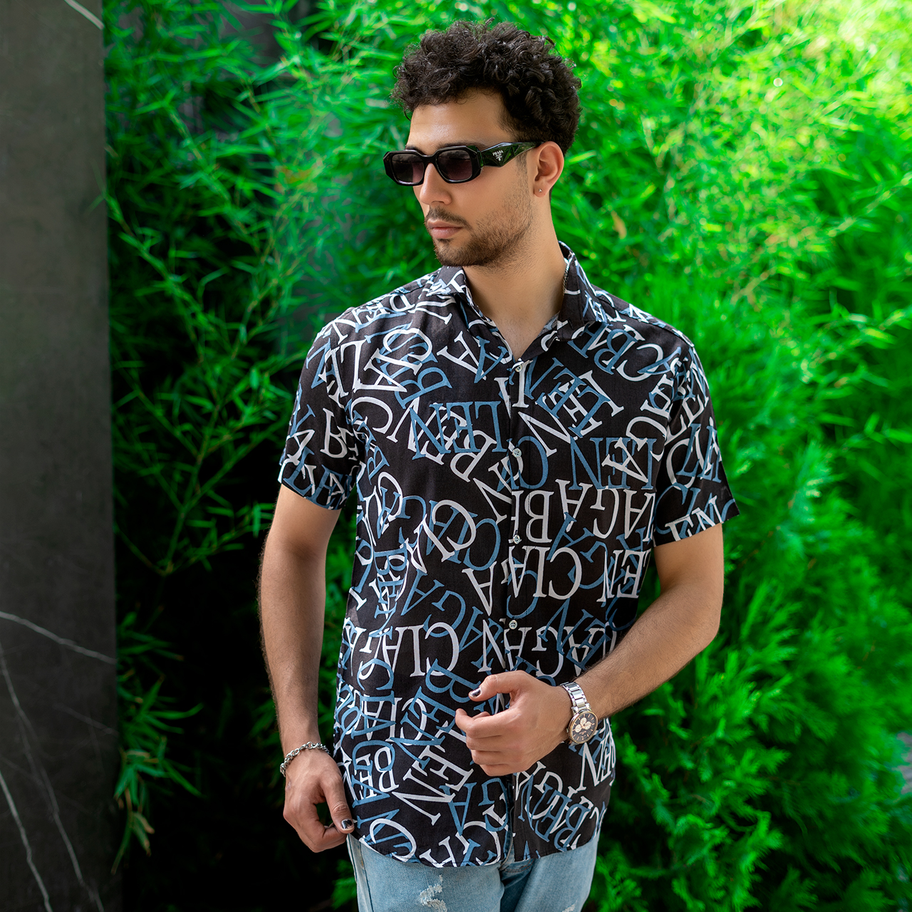 پیراهن هاوایی مردانه مشکی آبی مدل ABC