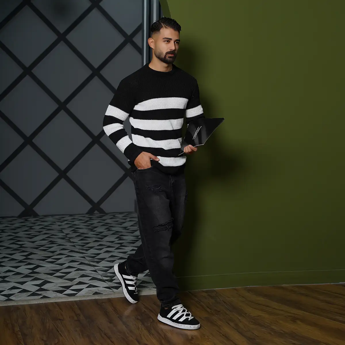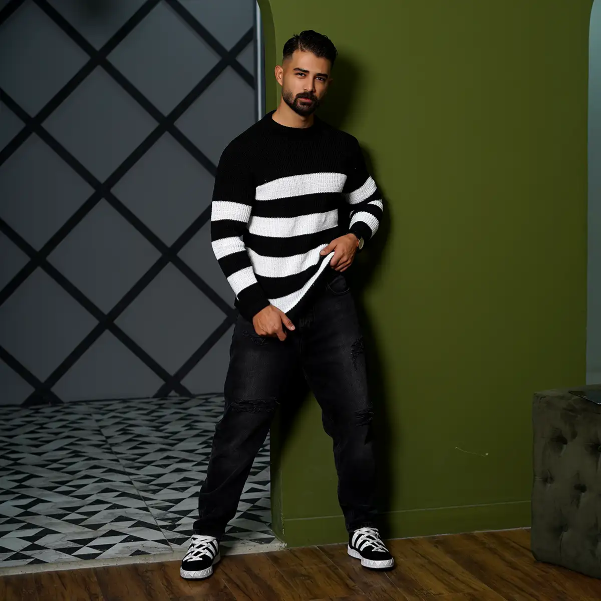 پلیور مردانه راه راه سفید مشکی مدل Mahyad